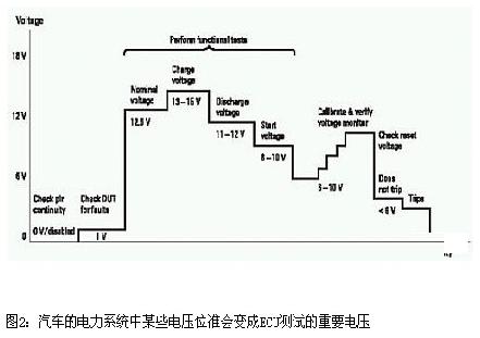 依汽車的操作狀態(tài)而定,在汽車的電力系統(tǒng)中常會(huì)碰到某些電壓位準(zhǔn)。這些位準(zhǔn)會(huì)變成ECU測試的重要電壓,如圖2所示。在這些重要電壓下執(zhí)行的一些相關(guān)測試包括: