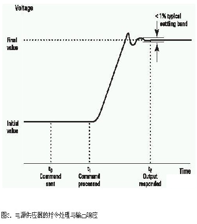 將電源供應(yīng)器的輸出電壓設(shè)定變更為新值時(shí),必須經(jīng)歷幾個(gè)步驟,如圖3 所示。這些步驟所花的時(shí)間很有限。當(dāng)電源供應(yīng)器接收到指令時(shí),必須加以處理,因此會(huì)有一段指令處理時(shí)間。接著,電源供應(yīng)器的輸出會(huì)予以回應(yīng)并變更成新的設(shè)定。它在某個(gè)穩(wěn)定區(qū)段內(nèi)達(dá)到終值所花的時(shí)間,即為輸出響應(yīng)時(shí)間。1%的穩(wěn)定區(qū)段對ECU 測試來說是合適的。特別需要注意的是下調(diào)設(shè)定時(shí)的輸出響應(yīng)時(shí)間。許多電源供應(yīng)器都必須依賴真實(shí)的DUT 負(fù)載來降低電壓,在負(fù)載較小的情況下,一些不具下調(diào)設(shè)定器的電源供應(yīng)器可能需要花一秒左右的時(shí)間來達(dá)到終值。N6752A 電源供應(yīng)器模組內(nèi)建了一個(gè)下調(diào)設(shè)定器,能夠加快下調(diào)設(shè)定的速度,而不受負(fù)載的影響。在ECU 測試中,上調(diào)與下調(diào)設(shè)定都必須夠快才行?! ?br />