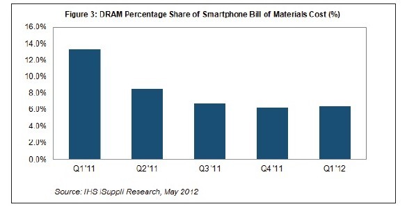 據(jù)IHS iSuppli公司的DRAM動(dòng)態(tài)簡報(bào),雖然智能手機(jī)的材料清單(BOM)成本穩(wěn)步上升,但一年來DRAM在其中所占的份額卻下降了一半以上,主要是因?yàn)镈RAM價(jià)格下跌。