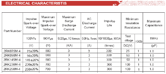• 一般依據客戶產品防雷測試等級的要求進行選取,來決定所選放電管的通流量及相應的尺寸規格