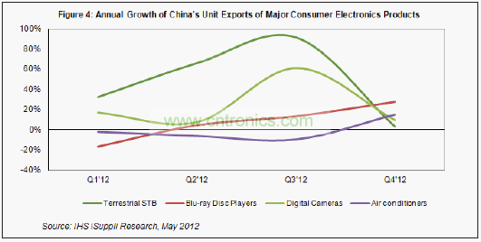 據IHS iSuppli公司的中國研究服務,2012年第一季度中國主要消費電子產品的出口高于預期,主要是因為銷售渠道中的庫存較低,需要購買更多產品以補充庫存。