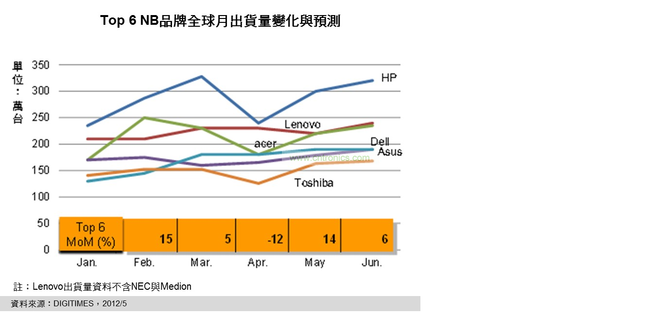 DIGITIMES Research資深分析師兼主任簡佩萍分析,品牌與代工廠NB月出貨量方面,在歷經低迷的4月后,5月搭配英特爾(Intel)新品NB鋪貨效應,出現兩位數的月成長幅度;但整體而言仍較先前預測的出貨成長緩和許多,尤其對6月份的出貨展望,全球前6大品牌普遍保守,預期前6大品牌月NB出貨量成長幅度也將因此驟降至個位數。