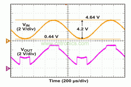 為了測試該電路,我們將VCC/2 = 5V DC偏移的300 Hz正弦波應用于輸入端。在VOUT出現變化以前,一直對AC幅值進行調節。如圖4所示,當應用10 Vp-p輸入時,VOUT在正軌附近出現一個經削波的信號,而非負軌附近。如果輸入超出VCC – 0.8V(本例中為9.2V),這種正軌附近出現的非理想行為是我們能夠預計到的。9.2V以下VIN電平和低至0V時,VOUT顯示出正確的波形,正如我們所預期的那樣。