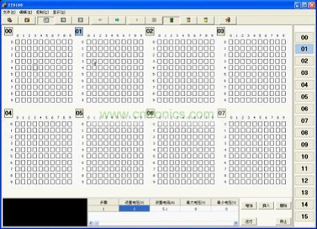 在此界面中,可以同時觀測到16*32個通道的LED照明或背光產品的老化。總共分為16組, 每組可達32個通道, 并用數組表示。界面上每個方塊代表一個通道,當該通道配置時,該通道方塊呈灰色。用顏色來區分不同的運行狀態,能使用戶在使用過程中更加清晰、簡便、快速的觀測到任何細微的變化。通常來說,為了符合人們的習慣,不同顏色所表示的功能如下: