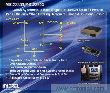 麥瑞半導體推出了采用HyperLight(R)Load技術的4MHz PWM 6A/3A同步降壓穩壓器系列產品MIC23603/303。MIC23603/303采用的專利架構提供了最高水準的瞬態性能,在全脈寬調制(PWM)模式下輸出紋波僅有5mV。MIC23603/303將低損耗的專利功率MOSFET與麥瑞半導體擁有專利的恒定導通時間直流-直流開關轉換器方案結合在一起,可提供高達6A/3A的輸出電流,同時僅消耗24μA靜態電流。MIC23603/303是驅動機頂盒、便攜式設備以及汽車儀表中的FPGA、ASIC和DSP集成電路的理想產品,在這些應用中,超快瞬態響應和輕載效率至關重要。MIC23603目前已經開始批量供應,千片訂量的價格為1.08美元/片。MIC23603的千片訂量價格為0.49美元/片。