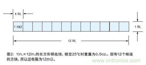 我們舉一個(gè)簡(jiǎn)單的例子。圖2是一條長(zhǎng)方形的銅走線,在25℃時(shí)其重量約為0.5oz.,走線寬度為1英寸,長(zhǎng)度為12英寸。我們可以將走線分解成一系列方塊,每個(gè)方塊邊長(zhǎng)都是1英寸。這樣,總共就有12個(gè)方塊。按照表2,每個(gè)0.5oz.重的銅箔方塊的電阻為1mΩ,現(xiàn)在共有12個(gè)方塊,因此走線的總電阻為12mΩ。