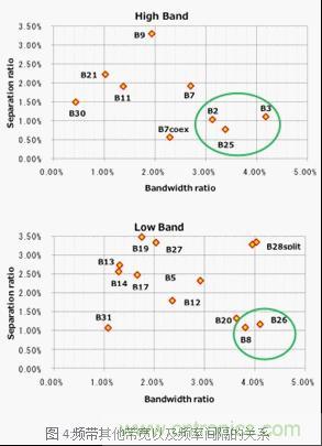 雙工器的設計根據Third Generation Partnership Project (3GPP)的規格根據頻帶的送信和收信帶寬以及送信端和收信端的頻率間隔(Separation ratio)決定了其難易度。一般來說頻率的帶寬越廣那么送信端和收信端的頻率間隔越小難易度就越高。總結兩者的關系來看,如圖4。村田制作所正致力于圖4中圈出的部分,計劃優先實現TC-SAW對應的產品。