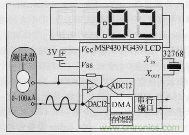 醫療傳感器節點框圖如圖2 所示,主要包括醫療傳感器模塊、ZigBee 通信模塊、處理器單元和電源4 部分。處理器單元如圖3 所示,主要分為CPU、存儲器、AD 轉換、測試帶和數碼顯示屏5 部分。根據低功耗和處理能力的需要,采用TI公司的MSP430 系列單片機,存儲器部分主要用于存儲傳感器所采集的臨時數據,在處理器將數據傳輸之后,傳感器節點內不做數據的大量存儲。