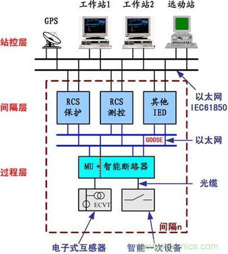 IEC 61850 標準是變電站自動化領域最為完善的通信標準,該標準將變電站自動化系統分為三個層次,即站控層、間隔層、過程層。站控層包括監控主機、操作員工作站、遠動工作站、工程師工作站、GPS對時裝置等,形成全站監控管理中心。間隔層包括繼電保護裝置、測控裝置等二次設備。過程層包括變壓器、斷路器、隔離開關、互感器等一次設備及其所屬的智能組件。如圖1-1所示。