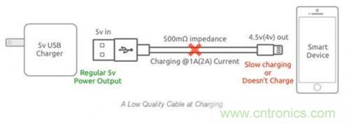 還拿上面那個例子來解釋,在2A充電電流下,會產生1V的電壓降,設備端充電電壓僅為4V。除了可能會帶來安全性問題之外,對智能設備而言,這么低的電壓甚至無法對設備充電。