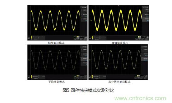 在了解完四種捕獲模式的工作原理之后,我們來做一個對比,在輸入一個相同的信號時,標(biāo)準(zhǔn)捕獲模式下可以觀察到信號中存在噪聲,峰值捕獲模式下信號的噪聲較為明顯,而在平均捕獲模式及高分辨率捕獲模式下,幾乎沒有看到隨機(jī)噪聲。