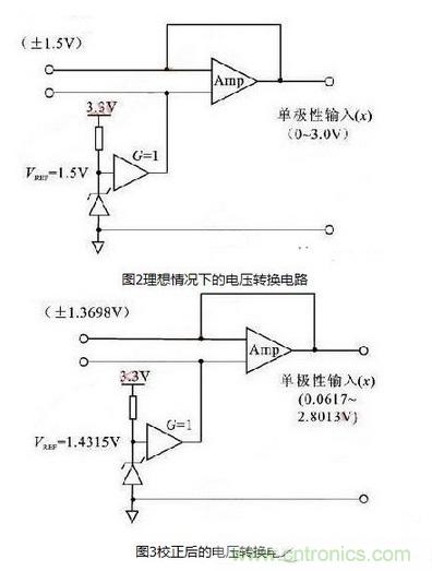 在實(shí)際應(yīng)用中,所采集的信號(hào)經(jīng)常為雙極型信號(hào),因此信號(hào)在送至ADC之前需要添加轉(zhuǎn)換電路,將雙極型信號(hào)轉(zhuǎn)化為單極型信號(hào)。典型的轉(zhuǎn)換電路如圖2所示。對(duì)于ADC模塊,考慮到增益誤差和失調(diào)誤差對(duì)輸入范圍的影響,轉(zhuǎn)換電路需要調(diào)整為如圖3所示的電路。在圖3中,輸入增益誤差的參考范圍已經(jīng)改變。