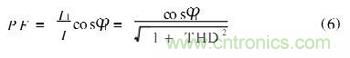 2) 若系統輸入電壓為標準的正弦波,僅有基波分量,即有效值電壓為基波電壓,輸入電流是非正弦信號,即包含基波分量,又含有其它高次諧波。電流基波分量的有效值可視為基波分量的有功分量和無功分量的正交合成φ1為輸入電壓與輸入電流基波之間的相位角。故P = UI1cosφ1,代入式(4)得