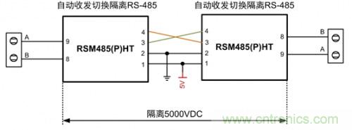 RS485的應(yīng)用中,有時(shí)需對(duì)信號(hào)進(jìn)行增強(qiáng),或不同的RS485網(wǎng)絡(luò)之間進(jìn)行電氣隔離,輸入和輸出都是RS485信號(hào),此時(shí)需用到RS485的中繼器。而基于RSM485系列,可快速搭建簡易的隔離型RS485中繼器,如圖2 和圖3所示。