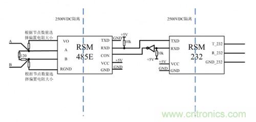 方案一是使用普通的TTL轉(zhuǎn)232電平IC做232到TTL的電平轉(zhuǎn)換,隔離電壓2500VDC,方案二是232端和485端均采用隔離模塊,485到232端的隔離電壓可高達(dá)5000VDC。