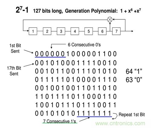 在圖一中可以看到,PRBS7最長是127bit(27-1), 理論上來說,7bit的2進制碼,一共會有27個不同組合,但是,如果碼流全部為‘0’的時候,經過異或運算,輸入到寄存器第一位的值還是0, 這樣移位寄存器將會一直輸出為零,移位寄存器被死鎖。所以PRBS碼流不能全部為零。另外,PRBS7 碼流中最長的連續‘1’個數為7個,最長的連續‘0’個數為6個。127bit的連續碼流中,一共有64個‘1’,63個‘0’。