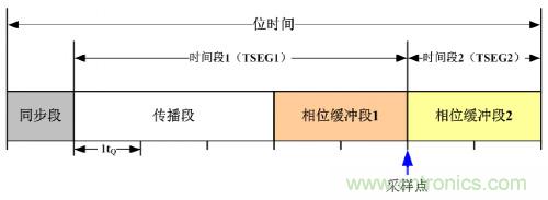 CAN總線里我們可以通過對CAN 節點里的位定時寄存器的控制來實現不同波特率的通信。CAN協議里將一個位時間分為同步段、傳播段、相位緩沖段1和相位緩沖段2。每個段的時間長度都可以用一個整數的基本時間單位表示,該基本時間單位由系統的時鐘振蕩器分頻得到。