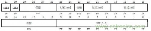 簡單的了解了CAN總線位時間的分段后,我們來看看一個節點的波特率到底要如何設置。如圖2是某ARM內核的CAN位時間特性寄存器 (CAN_BTR)。