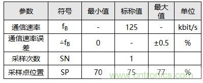 例如某著名車廠CAN通信標準里規定,通信速率為125 kbps時,應該采用單次采樣,采樣點位置設置在70%~77%之間。其位定時參數取值可見表1與表2。