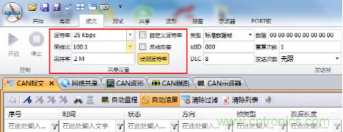 根據上面提到的原則,我們選取采樣點為75%,SJW為4,時間份額為14的一組參數,采用ZLG的CAN卡做驗證。