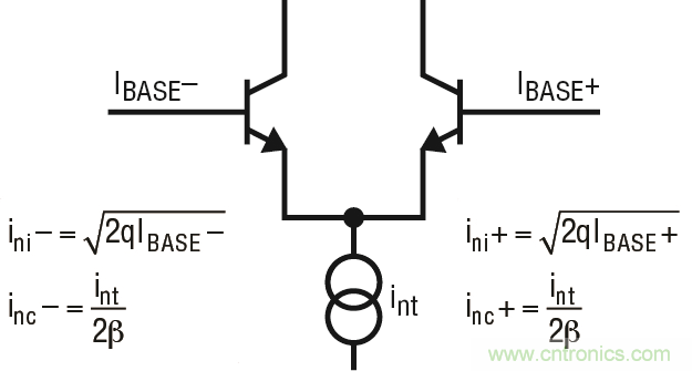 就寬帶噪聲而論,兩個輸入晶體管均具有與其基極相關聯的點噪聲 (ini- 和 ini+),這些點噪聲是不相干的。來自位于輸入對尾部之電流源的噪聲 (int) 還產生了在兩個輸入之間劃分的相干噪聲 (在每個輸入中為 int/2β)。如果兩個輸入上承載的電阻相等,則每個輸入上的相干電壓噪聲也是相等的,并且抵消 (根據放大器的共模抑制能力),因而留下的主要是不相干噪聲。這在產品手冊中被列為平衡電流噪聲。如果兩個輸入上的電阻極大地失配,則相干和不相干噪聲分量保留,而且電壓噪聲以平方根之和相加。這在有些產品手冊中列為不平衡噪聲電流。