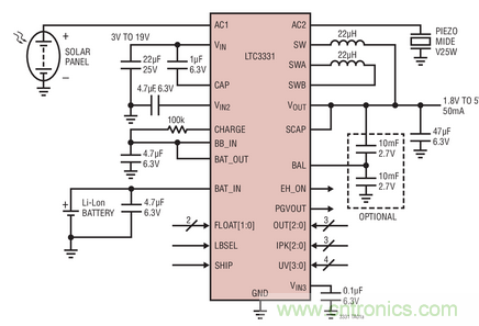 LTC3331 是一款完整的能量收集解決方案,提供高達 50mA 連續輸出電流,當可收集能量可用時能延長電池壽命。簡便的 10mA 分流器用收集的能量給可充電電池充電,同時低電池電量斷接功能保護電池免于深度放電。當用收集的能量向負載提供穩定功率時,該器件僅需要電池提供 200nA 電源電流,當在無負載情況下由電池供電時,僅需要 950nA 工作電流。LTC3331 集成了一個高壓能量收集電源、一個電池充電器和一個同步降壓-升壓型 DC/DC 轉換器,可為能量收集應用提供一個持續穩定的輸出,例如無線傳感器網絡中的能量收集應用。能量收集電源由適合 AC 或 DC 輸入的全波橋式整流器和高效率降壓型轉換器組成,從壓電 (AC)、太陽能 (DC)、或磁性 (AC) 能源收集能量。當沒有收集能量可用時,可充電電池輸入給降壓-升壓型轉換器供電,該轉換器在直至 4.2V 的整個電池電壓范圍內運行,無論輸入高于、低于或等于輸出,都可調節輸出。當收集能源不再可用時,LTC3331 自動轉換至電池。LTC3331 的能量收集輸入在 3V 至 19V AC 或 DC 電壓范圍內運行,從而使該器件非常適合多種壓電、太陽能或磁性能源。其輸入欠壓閉鎖門限設定是可編程的,范圍為 3V 至 18V,從而使應用能夠在峰值功率傳送點上運行能量收集電源。其他特點包括引腳可編程輸出電壓和降壓-升壓峰值電流限制、一個超級電容器平衡器和一個輸入保護性分路器。LTC3331 采用耐熱增強型 5mm x 5mm QFN 封裝。圖 3 顯示了 LTC3331 的典型應用電路。