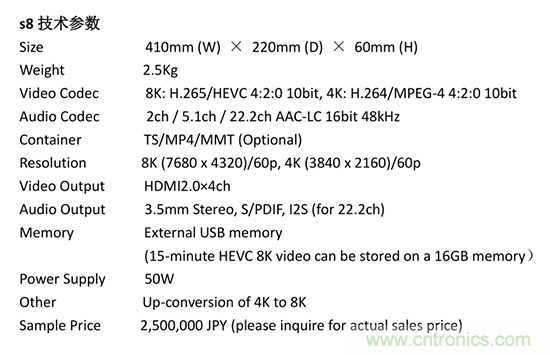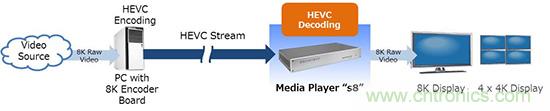 索喜科技通過(guò)搭載4枚LSI“MB86M31”組成8K HEVC實(shí)時(shí)編碼系統(tǒng),配合媒體播放器s8,完成8K影像編碼、發(fā)送、解碼、顯示所有必須的影像處理,為8K影像發(fā)送提供整體解決方案。