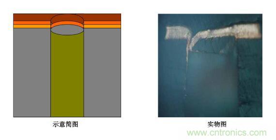 5.圖電孔無(wú)銅:斷口處圖電層未將板電層包住―――圖電層與板電層厚度均勻,斷口處齊斷;圖電層呈拉尖趨勢(shì)直至消失,板電層超過(guò)圖電層繼續(xù)延伸一段距離再行斷開。