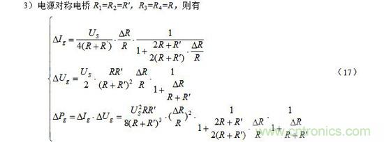 注意:上面(7)~(9)式中的R和其R′ 均為預調平衡后的電阻。此外,當電阻增量△R較小時,即滿足△R《《R時,上面(7)~(9)三式的分母中含△R項可略去,公式可得以簡化,這里從略。