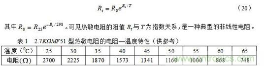 其中R25和Rt分別為25℃和t℃時熱敏電阻的阻值,T = 273 + t;Bn為材料常數,其值因制作時不同的處理方法而異,對確定的熱敏電阻,可以由實驗測得的電阻—溫度曲線求得。我們也可以把(19)式寫成比較簡單的表達式