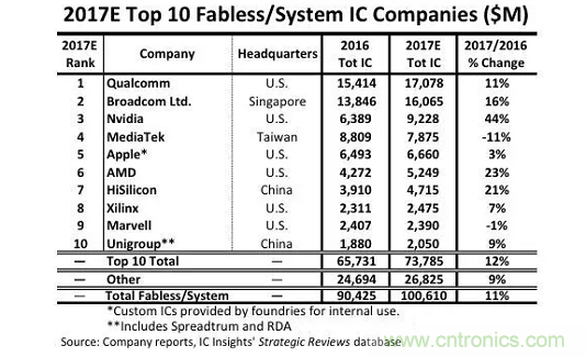 目前看來(lái),紫光展銳現(xiàn)在已經(jīng)是一個(gè)擁有4500員工、年?duì)I收超過(guò)100億元、中國(guó)第一、世界第三(僅次于高通和聯(lián)發(fā)科)的芯片設(shè)計(jì)公司。在ICinsights最新公布的數(shù)據(jù)里,紫光展銳也是排名世界第九的無(wú)晶圓廠,這是國(guó)內(nèi)除海思外,唯一入選的企業(yè)。多方面的數(shù)據(jù)證明,紫光展銳已經(jīng)在芯片世界擁有了不小的名頭。