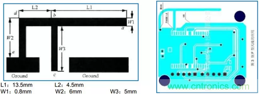 倒F型天線的天線體可以為線狀或者片狀,當使用介電常數較高的絕緣材料時還可以縮小藍牙天線尺寸。作為板載天線的一種,倒F型天線設計成本低但增加了一定體積,在實際應用中是最常見的一種。天線一般放置在PCB頂層,鋪地一般放在頂層并位于天線附近,但天線周圍務必不能放置地,周圍應是凈空區。如下圖: