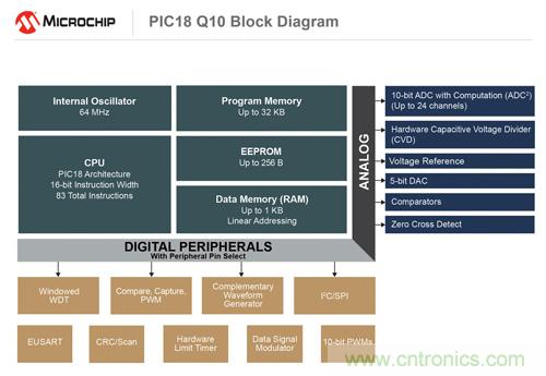 新型ATtiny1607系列采用緊湊型3 x 3 mm 20引腳QFN封裝,針對空間受限的閉環控制系統(如手持式電動工具和遙控器)進行了優化。 該系列器件不僅集成了高速模數轉換器(ADC),提高模擬信號轉換速度從而產生確定性系統響應,還提高了振蕩器精度,使設計師能夠減少外部元件并節省成本。 PIC18 Q10系列的CIP包括互補波形發生器 (CWG)外設,可簡化復雜的開關設計;帶計算功能的模數轉換器 (ADC2),可在硬件中執行高級計算和數據過濾,完全無需內核干預。 此類CIP讓CPU能夠執行人機接口 (HMI) 控制等更復雜的任務,并在無處理需求時保持低功能模式,實現節能。