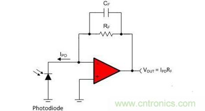 圖1:反饋電容器CF補(bǔ)償光電二極管接觸電容和運(yùn)算放大器輸入電容