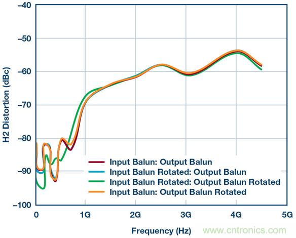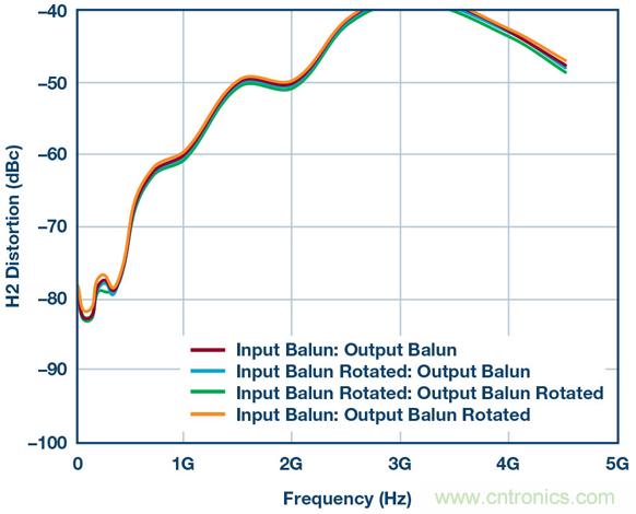 乍一看相當簡單,但魔鬼隱藏在細節中。圖3顯示了一組HD2測試結果,其系使用本框圖中的所有器件、差分放大器、巴倫、衰減器等得到的。這些測試證明:僅僅用不同方式翻轉巴倫方向所導致的細微相位不匹配,便能在HD2掃頻中產生不同結果。此設置中有兩個巴倫,因此通過顛倒設置一側或兩側的連接可以創建四種可能的場景。結果如圖3所示。