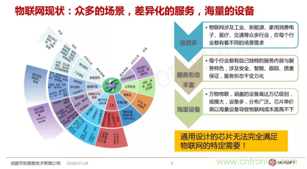 天軟信息在NB-IoT這個產業鏈上扮演的角色是要打造一個端到端的運營方案,從芯片到運營整體,黃總指出,通用設計的芯片無法滿足物聯網的特定需要,物聯網是一個海量兼容的設備,不同領域的設備有著完全不一樣的形態要求,所以提出了一個觀念叫做服務定義芯片。傳統的芯片設計行業,芯片設計商定義一個芯片是根據市場需求和發展趨勢來定義這個芯片的規格,然后交由芯片制造商去做具體的制造的工藝設計規劃,而現在的模式是把設計服務這塊獨立出來,也就是說真正了解市場,接觸這個市場對這個行業發展把握非常精準的一些公司,他們會提出來定義具體的一款芯片需求,定義出來的芯片交到以前的芯片設計公司來完成設計的服務,芯片制造商來完成這個芯片的制造,天軟信息現在正在走的就是這樣的模式。