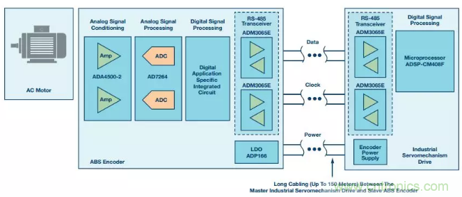 圖1顯示了一個電機控制信號鏈,其利用RS-485收發器和微處理器連接絕對編碼器(ABS編碼器)從機和工業伺服驅動器主機,以實現對交流電機的閉環控制。