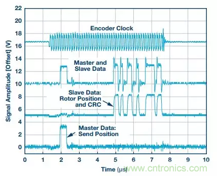 圖6顯示了EnDat系統的測試結果。測試使用的時鐘頻率為8 MHz,延遲補償通過接收時鐘相移實現。底部信號是來自EnDat主機的命令。此處顯示的命令為“發送位置”,其前面是兩個0,接著是六個1,最后又是兩個0。該命令總共有10位。編碼器的響應是從頂部起的第三個信號。合并數據線是從頂部起的第二個信號。最后,頂部信號是施加于編碼器的時鐘。
