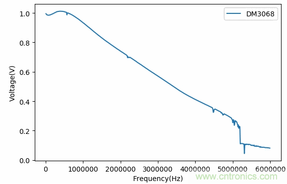 不同萬用表測量交流頻率的上限各不相同。下面使用DS345產(chǎn)生10kHz到6MHz,有效值為1V的正弦信號,使用DM3068數(shù)字萬用表交流電壓檔測量信號的幅值。