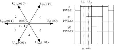 如圖2所示,電機(jī)的驅(qū)動采用了七段式的空間矢量法(SVPWM,SpaceVectorPWM),利用六個依次相差60度的基本矢量和全0矢量(與全1矢量等效),根據(jù)不同的作用時間合成按給定轉(zhuǎn)速作圓周轉(zhuǎn)動的旋轉(zhuǎn)矢量。