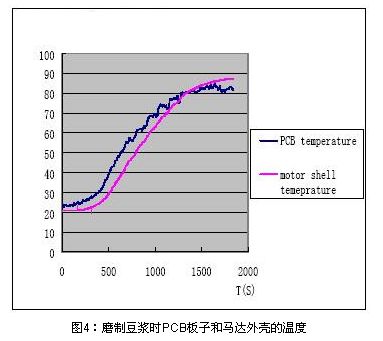 用上文所述的PPTC設計流程可以用在多功能豆漿機馬達防堵保護設計中,但這是往往會碰到選擇PPTC型號困難的問題,也就是說多功能豆漿機的馬達保護設計會較普通的小家電馬達保護復雜的多,圖4為磨制豆漿時PCB板周圍環境溫度和馬達外殼溫度的實測圖,可見控制電路PCB板PPTC周圍的環境溫度最高可以到達85C。由于豆漿機的PPTC最高環境溫度85度會比普通的小家電最高環境溫度要求高,這樣既要在85度的最大工作電流下能正常工作,還要保證在最低溫度0度的堵轉電流情況下能及時的保護,相應的就增大了設計難度。下面就具體的闡述此類多功能豆漿機馬達堵轉的保護設計方案。