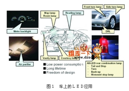 LED已經廣泛的應用于車內的相關照明或指示用光源,由圖1可知,從車內的儀表板燈、車頂燈、化妝燈、迎賓燈等,到車外的尾燈、前后轉向燈、倒車燈、第三剎車燈等都可見到LED的相關應用。