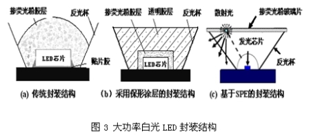 傳統的熒光粉涂敷方式是將熒光粉與灌封膠混合,然后點涂在芯片上。由于無法對熒光粉的涂敷厚度和形狀進行精確控制,導致出射光色彩不一致,出現偏藍光或者偏黃光。而Lumileds公司開發的保形涂層(Conformal coating)技術可實現熒光粉的均勻涂覆,保障了光色的均勻性,如圖3(b)。但研究表明,當熒光粉直接涂覆在芯片表面時,由于光散射的存在,出光效率較低。有鑒于此,美國Rensselaer 研究所提出了一種光子散射萃取工藝(Scattered Photon Extraction method,SPE),通過在芯片表面布置一個聚焦透鏡,并將含熒光粉的玻璃片置于距芯片一定位置,不僅提高了器件可靠性,而且大大提高了光效(60%),如圖3(c)。
