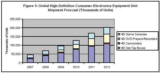 - 到2012年, 52.9%的付運(yùn)機(jī)頂盒、攝像機(jī)、DVD播放機(jī)和游戲機(jī)都會(huì)支持高清晰度,2008年只有21.6%