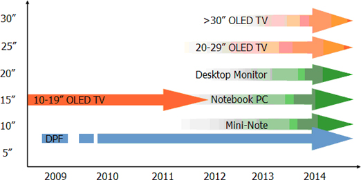 隨著技術(shù)進步,DisplaySearch預(yù)估AMOLED將進一步朝中大尺寸方向發(fā)展。筆記本計算機將是AMOLED廠商下一個關(guān)注的應(yīng)用方向,我們估計自2010年年中,廠商將有機會將AMOLED應(yīng)用在筆記本計算機上,而采用AMOLED面板上網(wǎng)本將有機會于2010年底開始量產(chǎn)。在TV方面,我們預(yù)期2010年底將會有大于20寸AMOLED TV被生產(chǎn),同時預(yù)期2011年大于30寸AMOLED TV 將會進入市場中。