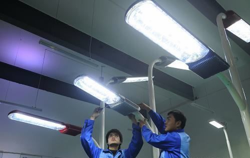 圖:技術(shù)人員在調(diào)試LED公路照明燈