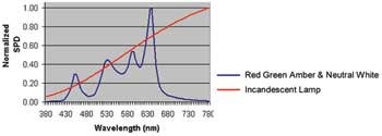 多通道驅(qū)動(dòng)器:就給定的色溫而言,高質(zhì)量CRI(90以上)會(huì)需要多種類(lèi)型的LED。CRI是光源的光譜能量分布(SPD)的一個(gè)函數(shù)。SPD是指給定波長(zhǎng)(頻率)下光源的輻射量。CRI數(shù)值表現(xiàn)最好(97以上)的白熾燈工作壽命較短(750~2500小時(shí)),效率也較低(美國(guó)能源部的數(shù)據(jù)為10~17Lm/W)。圖2顯示了白熾燈的SPD曲線與RGB光源曲線的對(duì)比情況。