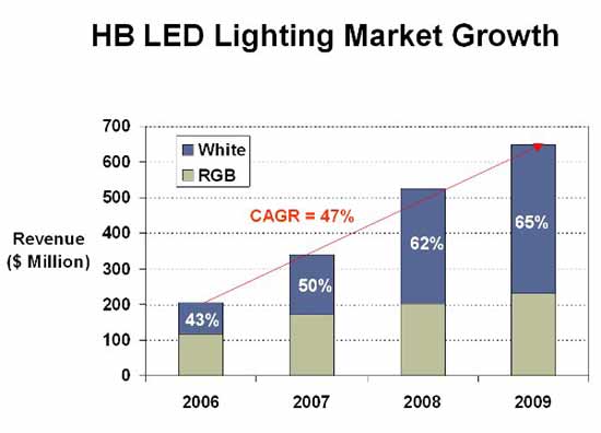 Bob Steele預計,2010年LED照明市場將會有32%的提升。在未來5年時間里,Bob Steele預測,替代燈將主宰改造市場,并且新型LED燈具將會出現緩慢增長。他預測,未來5年,用于照明的LED復合年均增長率將會達到44%.