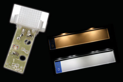 如圖2所示,光線可以從安裝在小尺寸PCB板上的表面貼裝LED器件發(fā)出,并使用限流電阻和反極性保護(hù)二極管。光線被直接照到簡(jiǎn)單或精心設(shè)計(jì)的導(dǎo)光管上,這是約束光線的極其簡(jiǎn)單方法。比較常用的方法是用適當(dāng)?shù)?ldquo;透鏡”或投光面體,安裝方法也經(jīng)常是在轎車(chē)內(nèi)部把它夾進(jìn)車(chē)門(mén)嵌板開(kāi)口的地方、中央控制臺(tái)或儀表盤(pán)上。