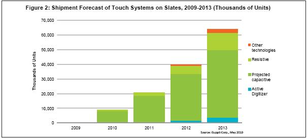 圖2所示為iSuppli公司對于2009-2013年平板電腦市場觸摸系統的預測。